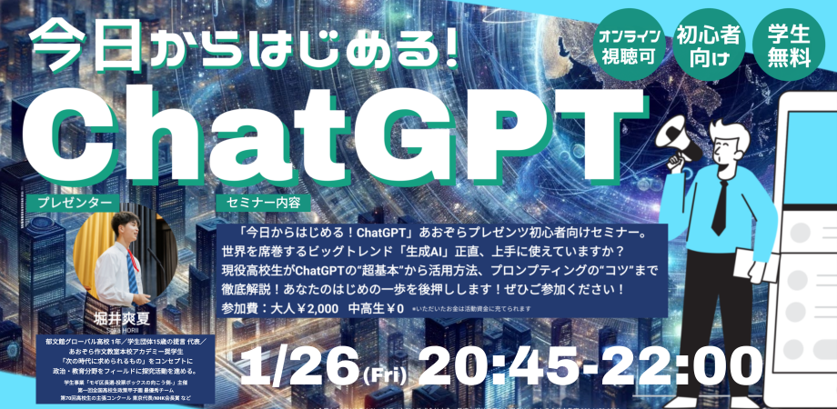 ぜひ、126日(火)20:45 からのオンライン講座「今日から始める!Chat GPT」にご参加ください。