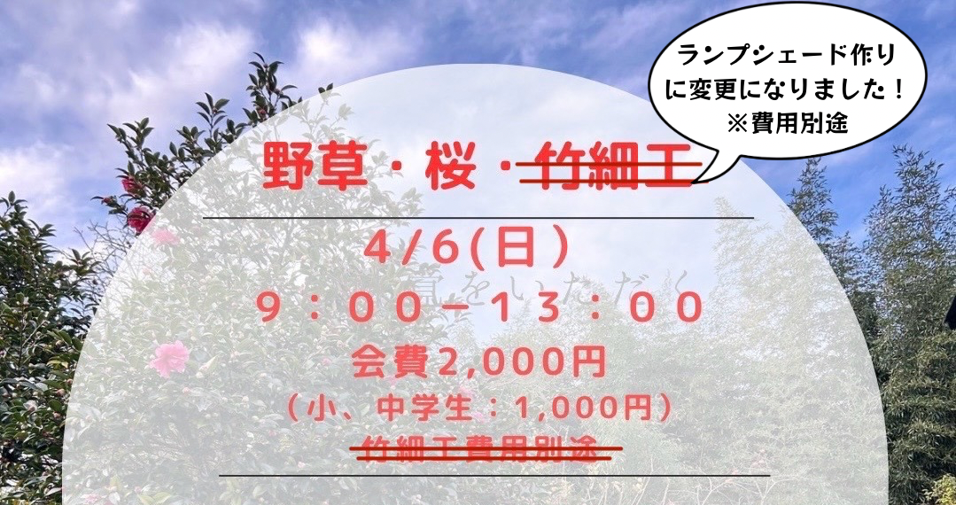 2025年最初の活動は、桜並木を散策しながら、つくしやのびるなどの野草を摘んだり、竹細工を楽しみます。散策のあとは、山崎邸の古民家ガーデンで軽食!地元の旬なお野菜を皆さんでいただきます。収穫して野菜の購入も可能!のんびりとした春の☘️風を感じるイベントです。桜も残っていれば見れるかも!?🌸