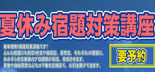 夏休み宿題対策講座 (8/3~7,17~20) 毎年恒例!宿題対策講座です‼️どんな宿題にも対応!作文や絵日記、感想文、それぞれの宿題に、あおぞら作文教室のプロ講師が対応。完成させます。算数や自由研究... 続きを読む