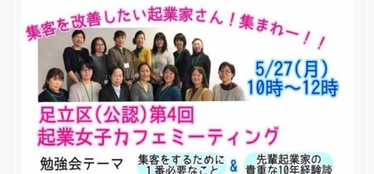 足立産業センターで、起業女子向けのカフェミーティングを開催します。 集客を改善したい起業家さん!集まれー! 【勉強会テーマ】 ・集客をするために一番必要なこと ・先輩起業家の貴重な10年経... 続きを読む