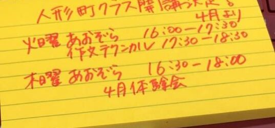 来年度、人形町クラスが拡大します。このお時間は、おおむね低学年の方に向けた体験会にする予定です。高学年の方は、16:30からの回をご利用下さい!火曜日人形町あおぞら16:00から17:30人形町作文テ... 続きを読む