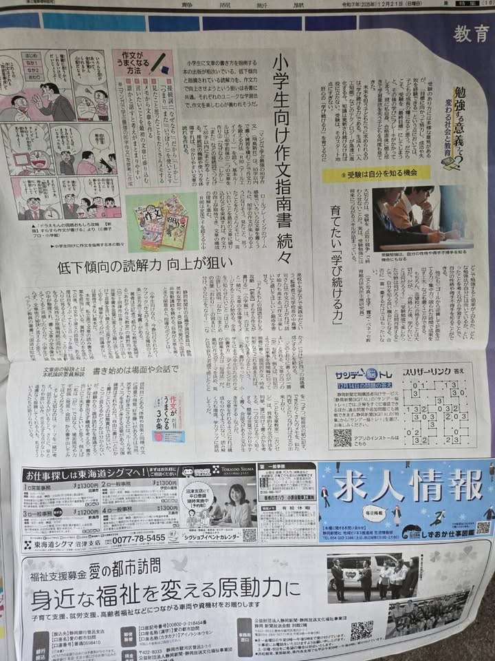 静岡新聞 教育面で「作文がうまくなる魔法の3か条」が書評と共に紹介されました!